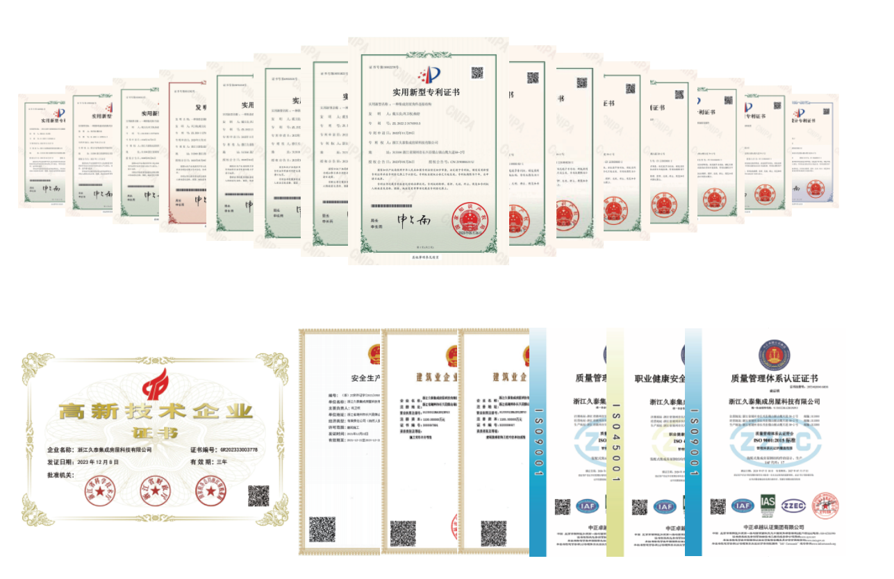 Zheiang Jiutai integrated Housing Technology Co,Ltd,located in Meishan Town, changxing County, Zheiang Province, takes the development and aplication of prefabncated standardized modules asthe industrial developmen direction and has been deeply engagedin the prefabricated buildingindustryfor 30 years. Relming on the dualcapabitiesof "innovative desien and safe manufactuine",the companyhas become a leadine a-round and one:stopsenice providerof prelabricated buildings in china Jiutai lntegration is equipped with a professional prefabricated building desien and management team, allcomposed of elite profesionals from the fields oftechnology coastructinn art dain and eouroameta nrntecion matenais The comanyhasindependent intelectua pinertyrients ortheitegrated housine enerey-savng sustem aplication materials, and housing rapid constnction technology development envices, and is commited to providing eficient,environmentallyfhiendly, and energy:saving building solutions for customers acros the countny, including the design,production,sales,instalation, leasing, marketing, and after-sales serice ofintegrated houses, stel structures, and accessories. At the same time iutailinterationowns 18 patents, constucion qualicaion cericates.Gradelloualicationfor decoraion and renovation aborsenice oualifcation safety permit and other certificates and qualifications.Ithas asedthe work safety standardization ls09001 quality managementsystem certifcation, and Huzhou Citylintegrit Enternse Cetifraton and has been ated as anatomalbiph-ech entemise, ithasa modern mantactuingfactovandfrsitrlas producionandtestingeouiomentin china its products are soldto customers in more than100reeions acros the county.with the number of customers exceeding 1.000.Thevare widely applied infields such as residence schools,hospitals,ofices, commercialcenters,hotels,and homestays,and have received unanimous praise from customer invarious industries,becoming an importantforce promotingindustryinnovation and development.